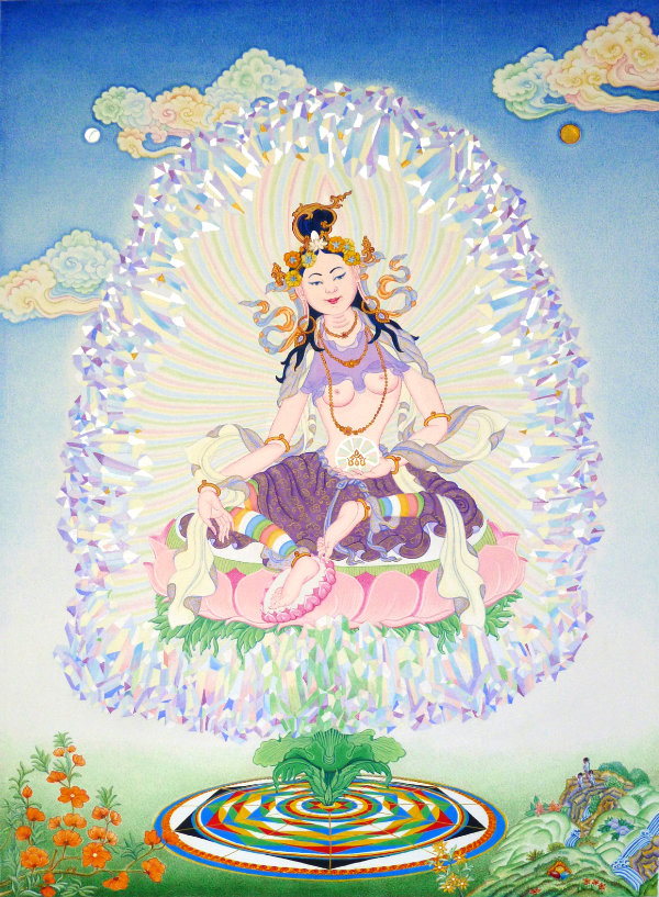 From the son of my aunt, who was a Geshe in the Gelugpa order, I learned how to draw a Buddha’s head which led me to taking courses with Andy Weber in the Netherlands in 1994. In the following years I painted White and Green Taras, and Mandarava. Over the following 15 years I combined Dharma art with my free artwork.