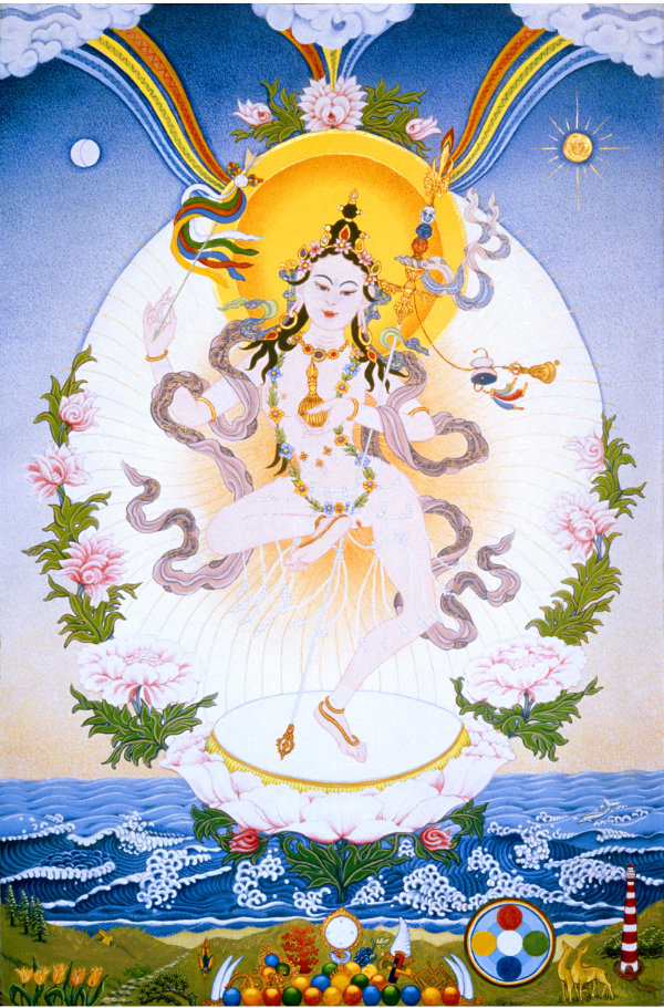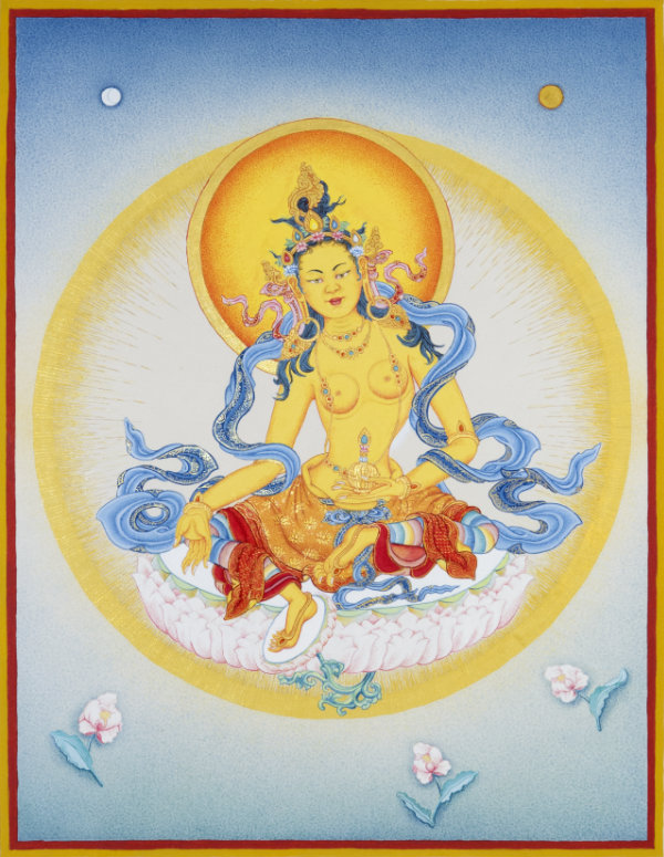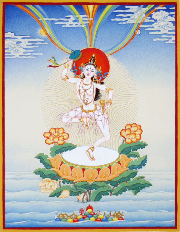 As a symbol of concentrating all the power, capacity, and blessings of the universe in the essence of primordial potentiality, her left hand holds a blood-filled kapala at the heart. As a symbol of the inseparability of method and prajña, she has a khatvanga in the crook of her left arm. As a symbol of manifesting in the total equality in which samsara and nirvana are nondual, her left leg is extended and her right leg is bent in a dance movement while she is standing in a dignified manner on the seat of a lotus, a sun disk, and a corpse. As a symbol of having naturally perfected all the qualities of total wisdom, she has all the ornaments of wrathful female manifestations.