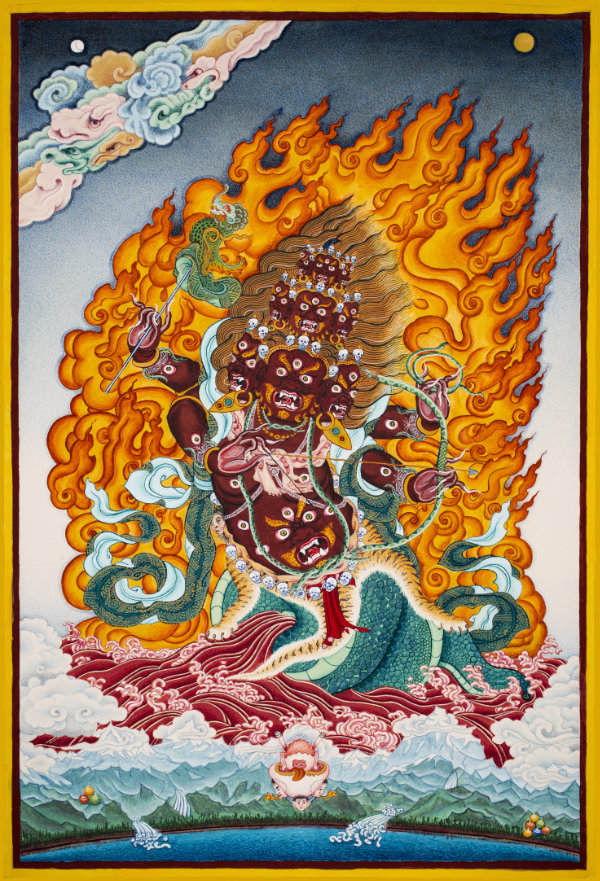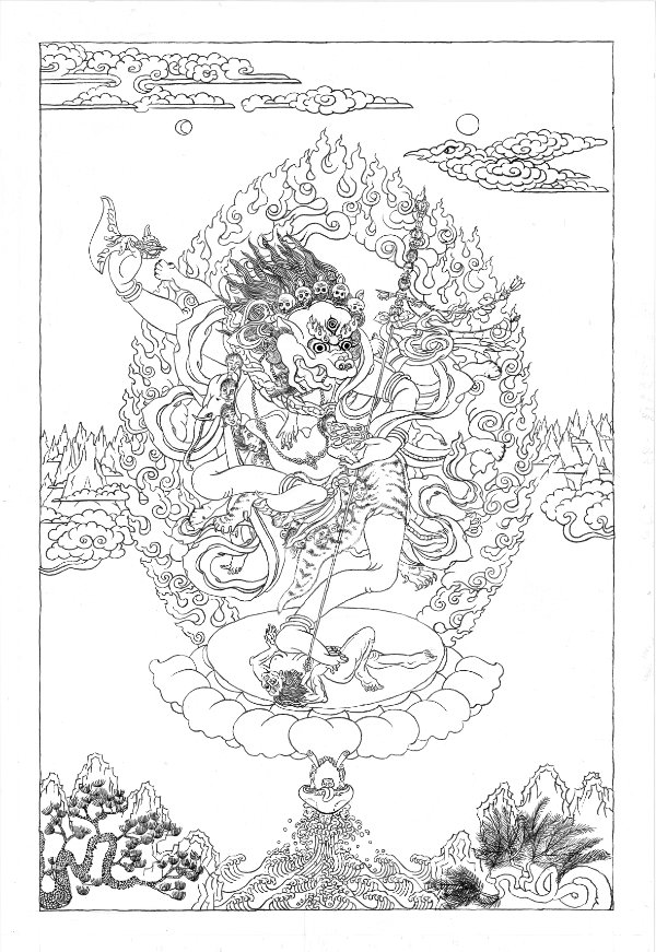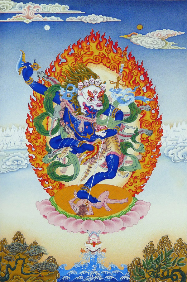 In a dimension of roaring fire and howling wind of wisdom, his body is dark red with a fiercely wrathful expression. To symbolize his command over the Great Secret Vajra, his right hand raises a vajra into the sky. As a symbol of having conquered all the arrogant classes of the universe by means of his power, his left hand squeezes a black, nine-headed scorpion. As a symbol of having completely perfected the power of the wrathful king Supreme Horse Manifestation (Hayagriva), Lord of Lotus Speech, in the midst of his upward-streaming, yellowish, braided hair a green horse head is distinctly neighing. As a symbol of having completely perfected the power of the five families of Garudas, the antidote for taming the powerful Nagas and Tsens of the universe, a Garuda soars above his head and he has wings made of meteorite. As a symbol of embodying the Vajra of mind of all the ocean of masters, sugatas, vidyadharas, and victorious ones, at the center of his heart, inside a thigle of five-colored light, is a brilliant dark blue syllable HŪM. As a symbol of having completely perfected the power of the Kilaya activity, the lower part of his body is shaped as a pointed triangular dagger. In order to totally tame the great classes of beings of this degenerate age who send provocations of energy, he is standing in a dignified manner with the blazing point of the dagger piercing the heart of a Gyalpo and a Senmo that lie across each other upon a lotus and sun disk.