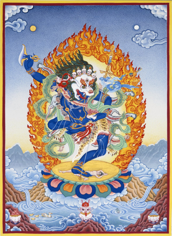 Her body is dark blue and her lion face is white with a fiercely wrathful expression. As a symbol of eradicating the emotions, the root of samsara, her right hand raises a curved knife, or trigug, with a vajra handle into the sky.